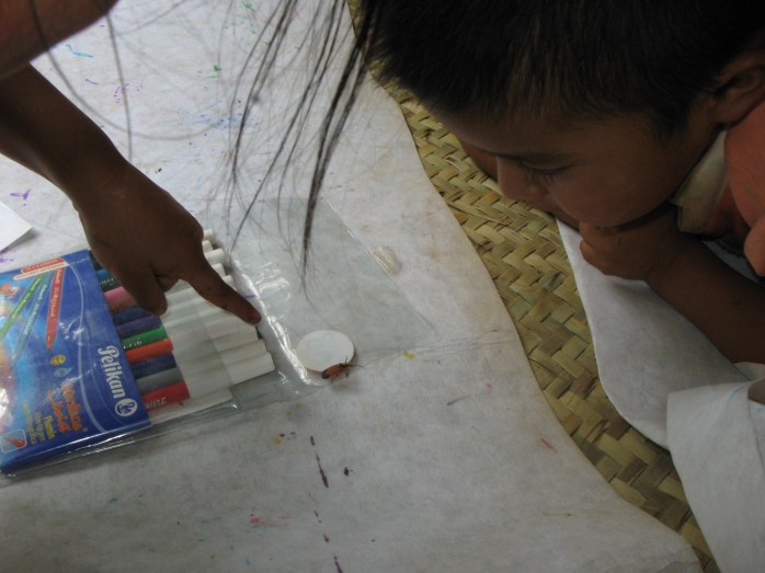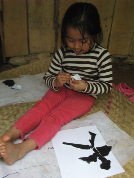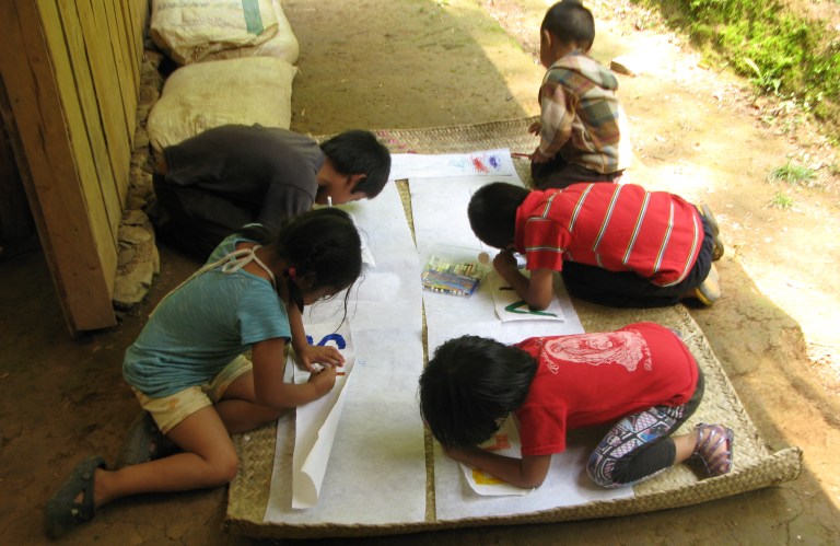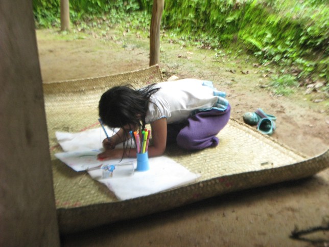 Sucede que no tenemos mesas ni sillas o bancos para podernos sentar y apoyar, así que la mejor opción que tuvimos cuando comenzaron a venir a pintar y dibujar fue poner un petate en el piso y sobre él desarrollar las actividades.