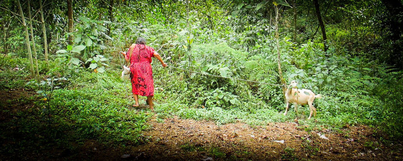 Las chivas se pusieron tercas y no querían caminar, pues así son, ella las jalaba, hasta que al fin, emprenden su camino.