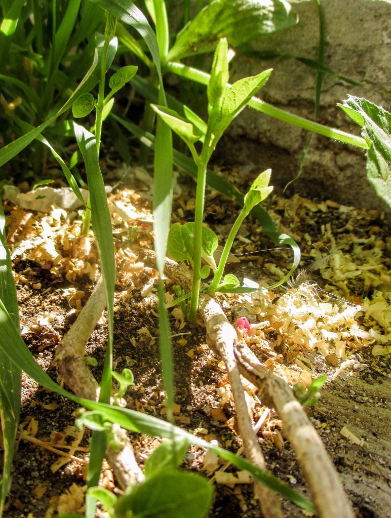 La enredadera tenía recién sus pequeños brotes que estaban creciendo a la sombra de la papaya y junto a una planta de calabacitas que estaba naciendo en el minihuerto. Estaba como escondida, era como si no quisiera que nadie la viera, me imagino que sobre todo esas hormigas invasoras que arrasan con todo y que se ve que al honguito le gustan mucho sus hojas.