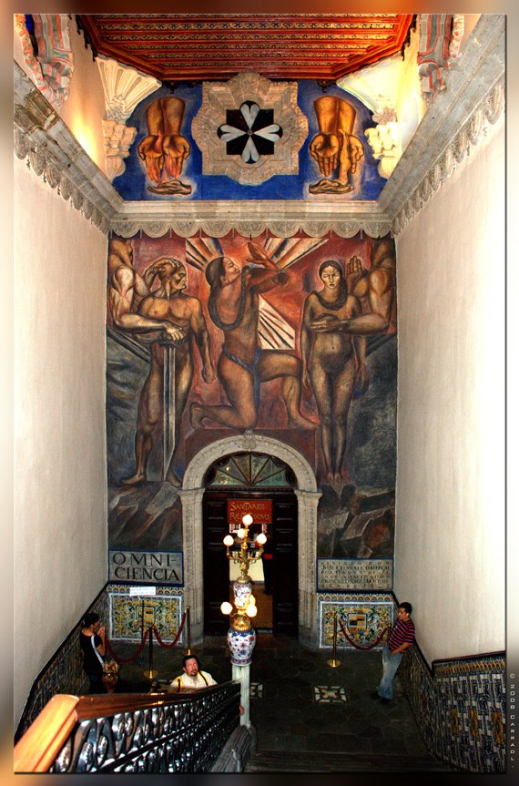 Abrimos la puerta, la característica tienda de regalos, tabaquería y farmacia se presentó a nuestros ojos, no muy diferentes a todas las otras sucursales que se extendían por la ciudad, sin embargo una pintura llamó mi atención, el mural «Omnisciencia» del pintor José Clemente Orozco uno de los grandes muralistas mexicano nos recibía.