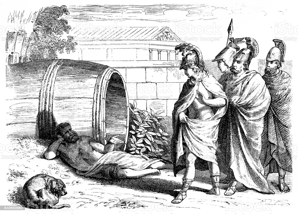 Una de las anécdotas más conocida de él es cuando va a visitarlo Alejandro Magno, ya que no se había dignado a irlo a recibir cuando llegó a la ciudad, en cambio el Emperador estaba curioso por conocer a ese hombre harapiento, del que todos hablaban, que su sabiduría era reconocida y que no tenía pelos en la lengua sin importar quién fuera.