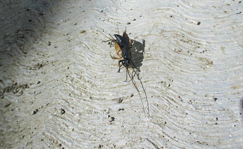 Me paré y me acerqué a ver de qué se trataba y cuál  fue mi sorpresa cuando descubrí que era una avispa, no muy grande, de esas negras que volvió a saltar como grillo.
