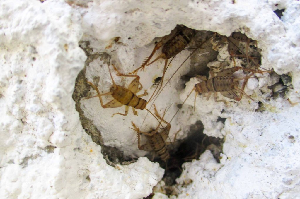 Pero otro día, ya pasado un tiempo me sorprendió que de un agujerito de la pared comenzaron a asomarse medio atontados al principio, para luego salir disparados como si algo los estuviera haciendo huir de su madriguera una cantidad de grillos.