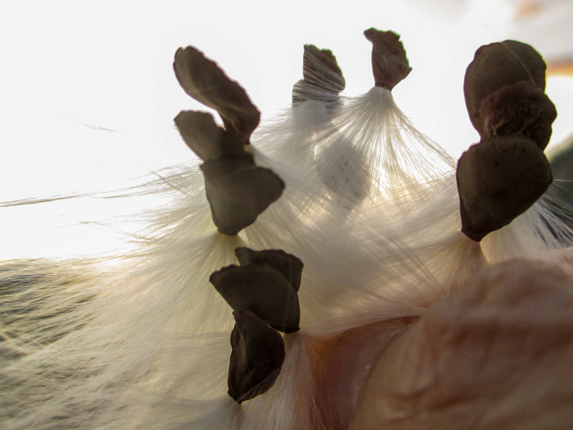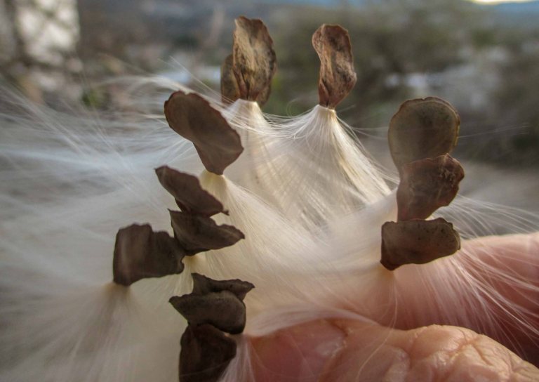 Tomé un grupo de penachos de filamentos con mis dedos, abandonaron el fruto y dejaron ver las semillas unidas a ellos, que maravillosa sensación sentir su suavidad, elevarlas, abrir mi mano y que el viento las fuera llevando por el aire cada vez más alto,. Volví a reproducir la acción y me puse a jugar con ellas, con esa posibilidad que me daban de encontrarme en ese instante preciso en donde estaban aguardando a que la brisa las liberara.