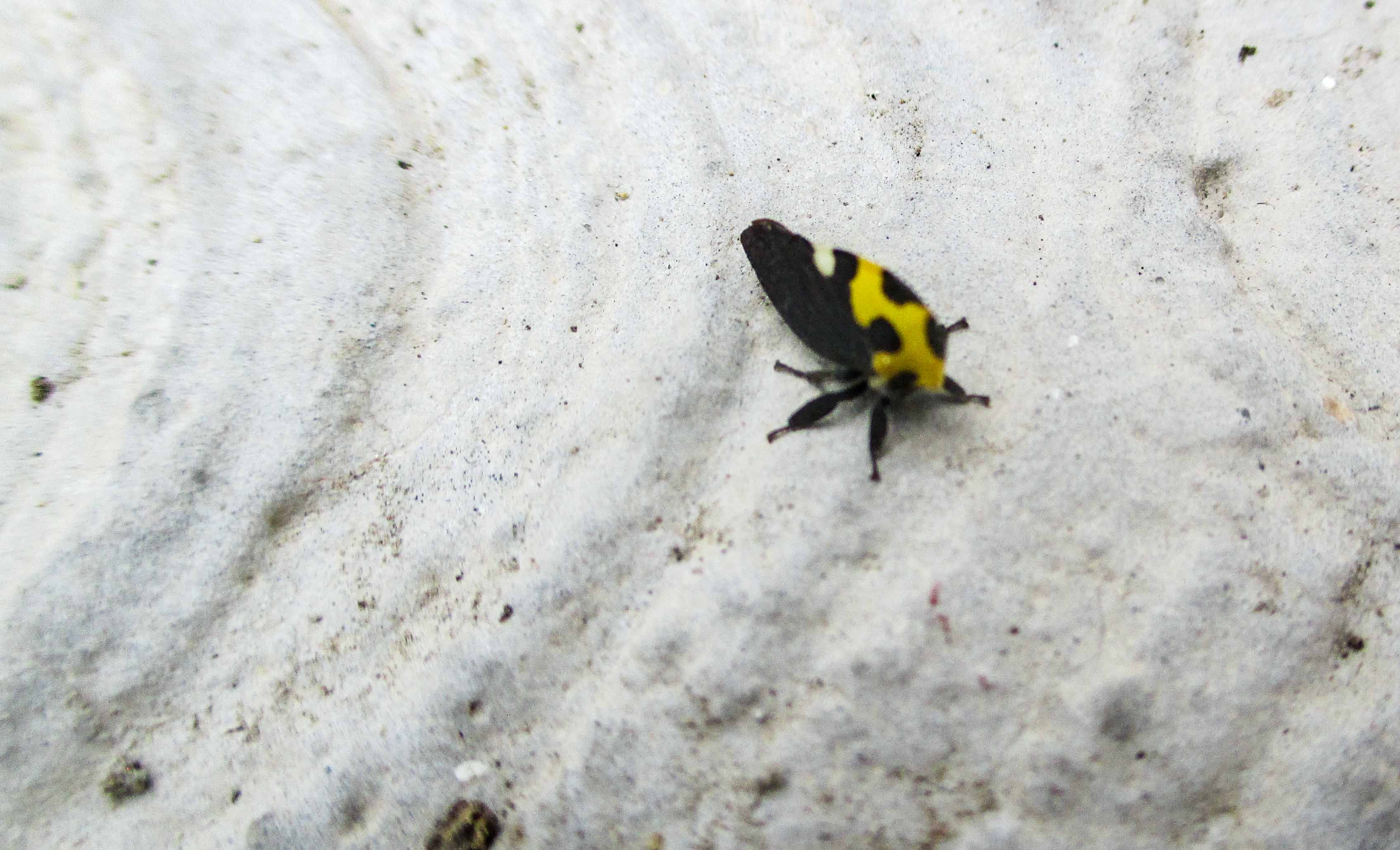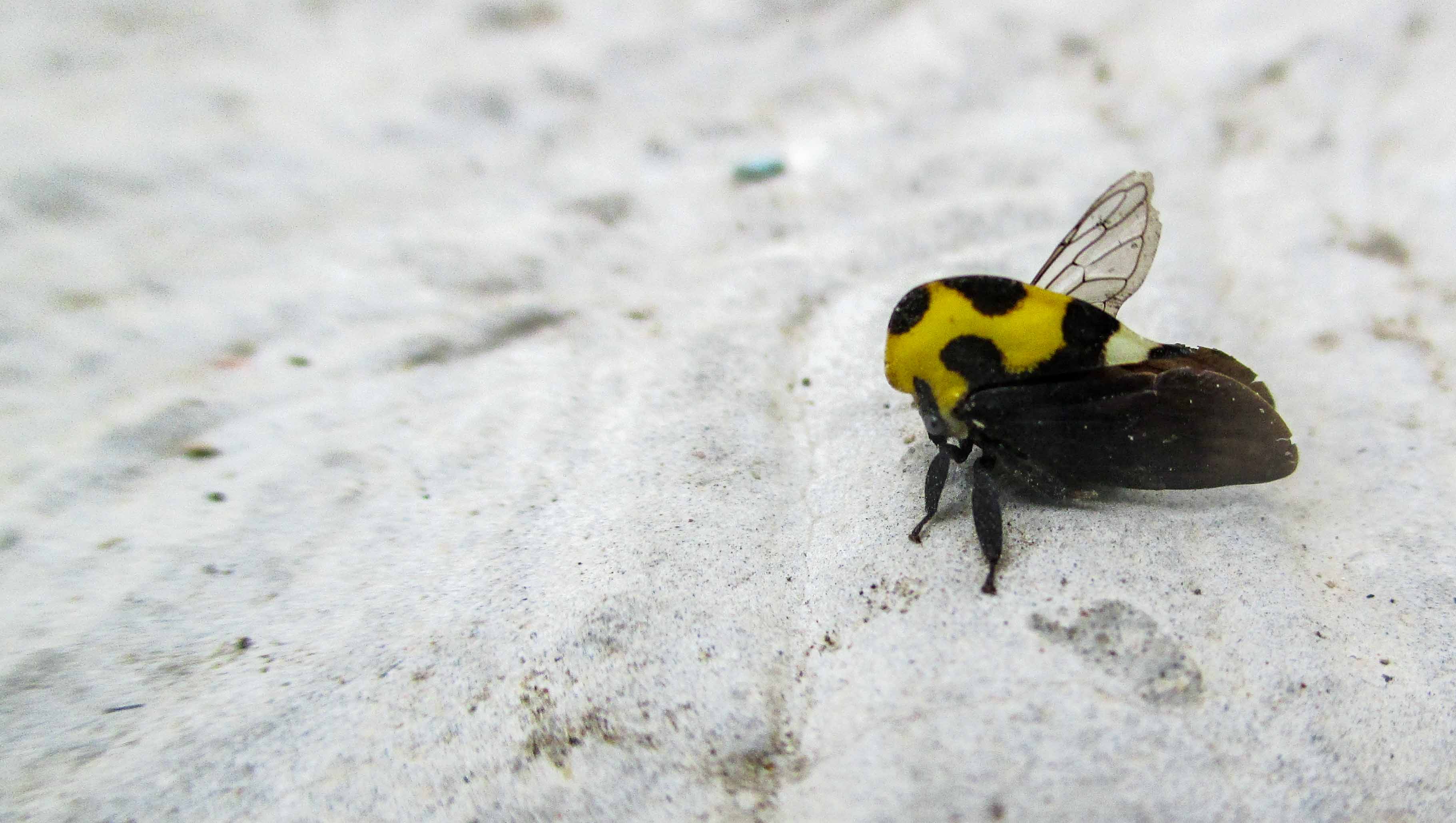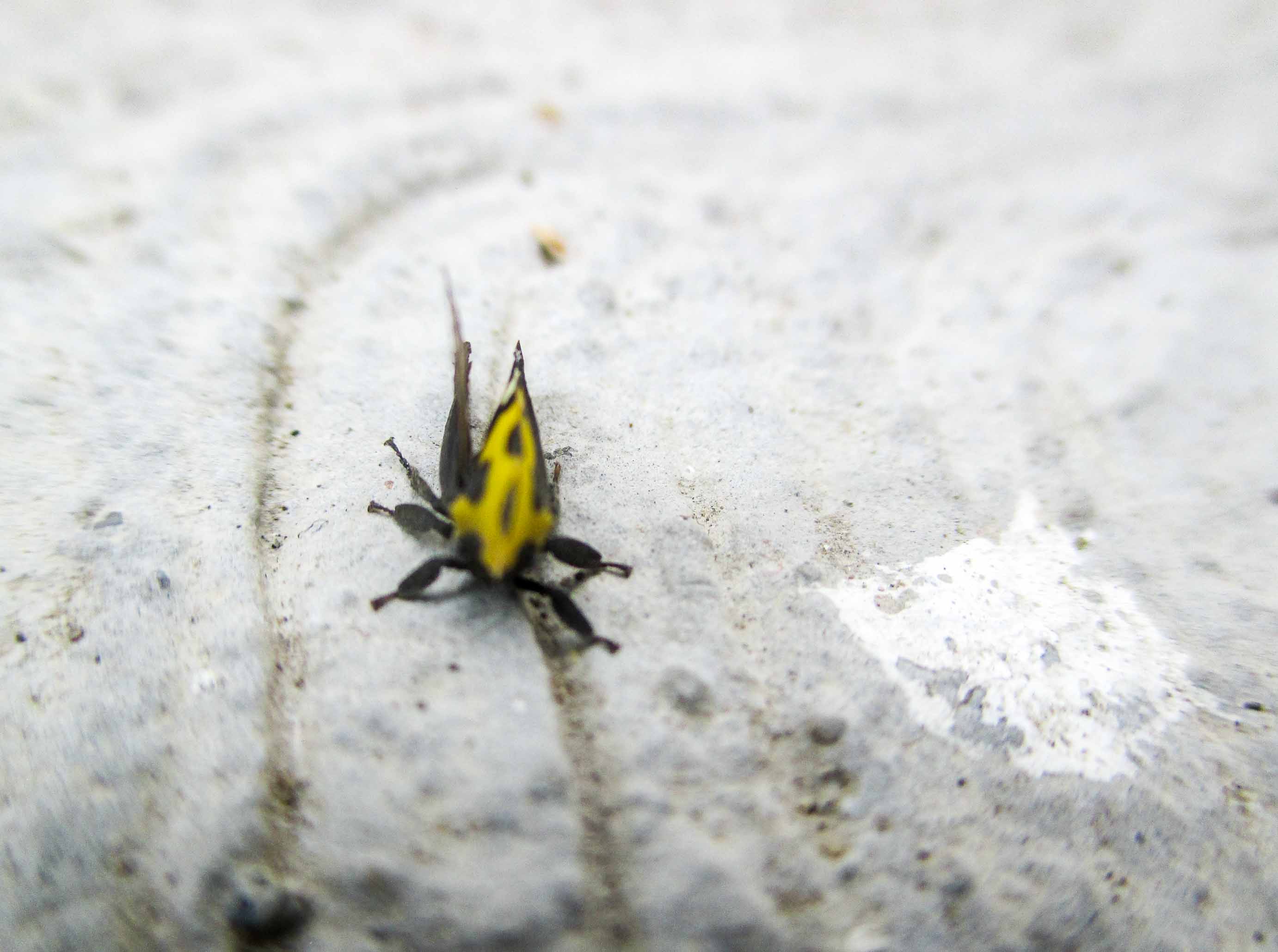 Es un ser muy bonito, chiquito, chiquito, mide unos milímetros nada más, tiene un cuerpo como de pirámide, es negro y amarillo, distribuido de tal forma que queda con un manto de lunares.