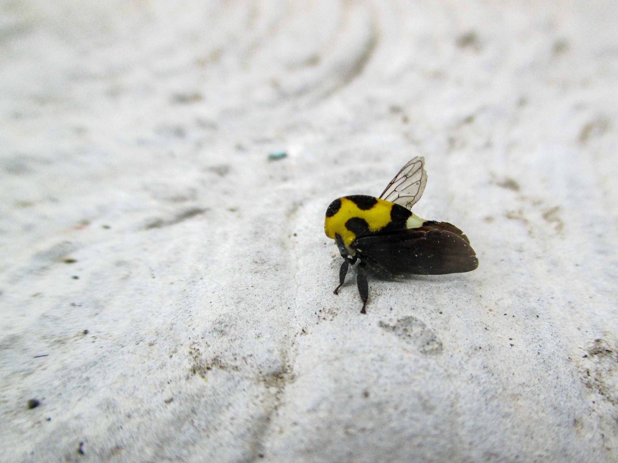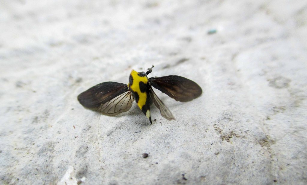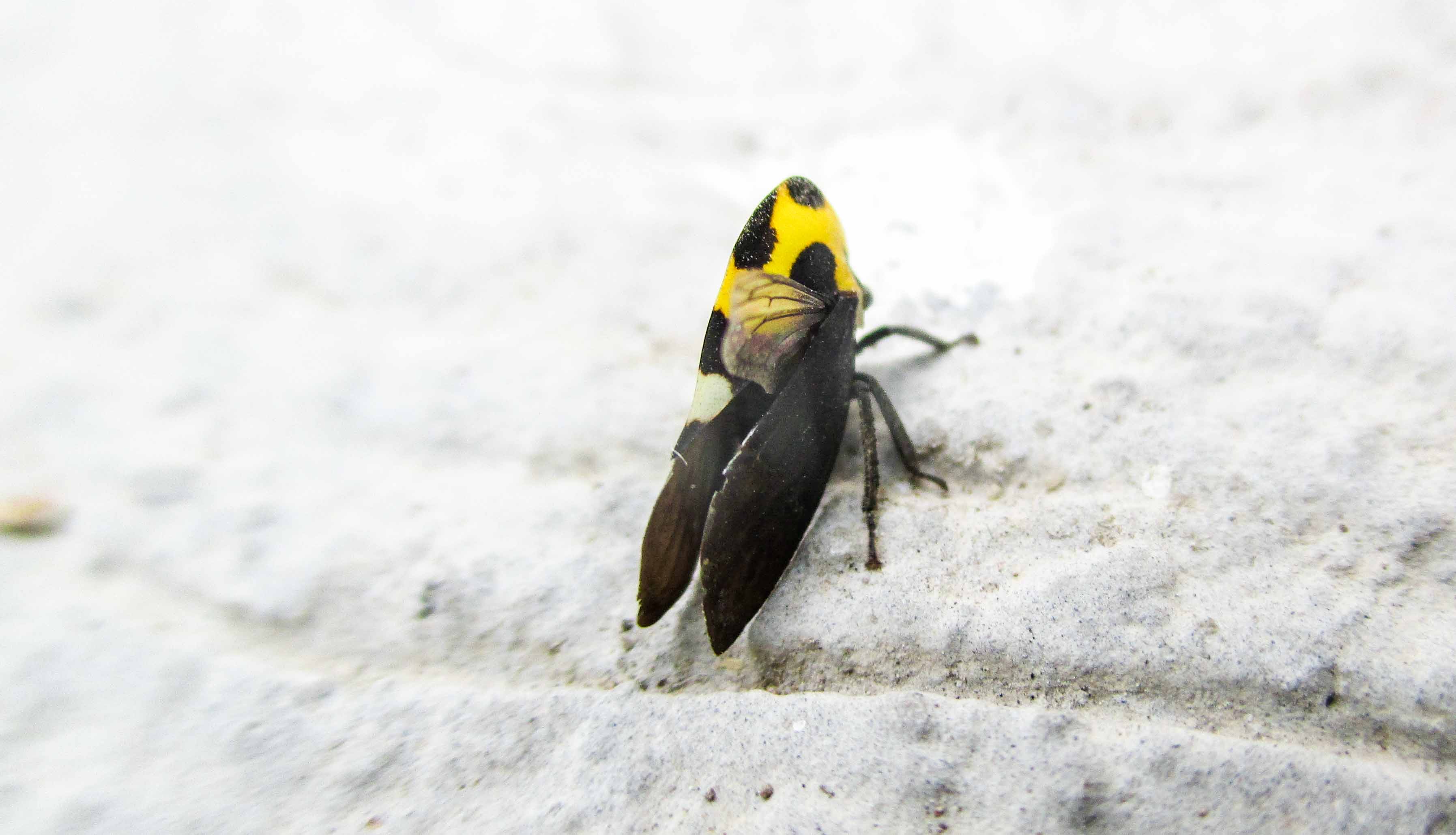 Es un ser muy bonito, chiquito, chiquito, mide unos milímetros nada más, tiene un cuerpo como de pirámide, es negro y amarillo, distribuido de tal forma que queda con un manto de lunares.