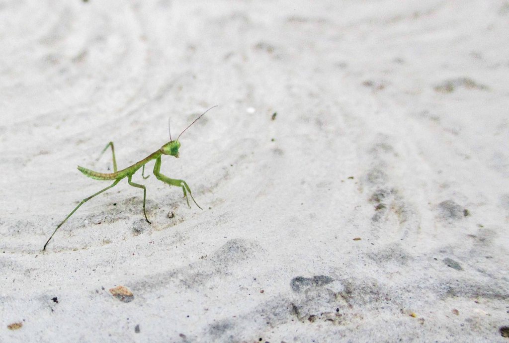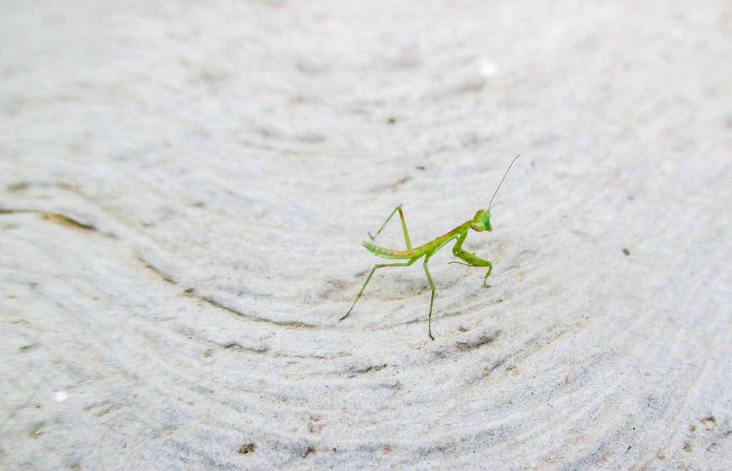 Me levanto en un ¡TRIS!, me acerco y ahí la veo, una ínfima mantis, pequeña pequeñita, la cual me queda mirando con cara de no buenas amigas, está como enojada con el lente de la cámara, ¡CLICK!, una foto, ¡CLICK!, otra y al tercer ¡CLICK!, se ve que ya la hartó y salta y se me sube a la mano y ahora si con unos grandes ojos negros detiene su mirada en mí.