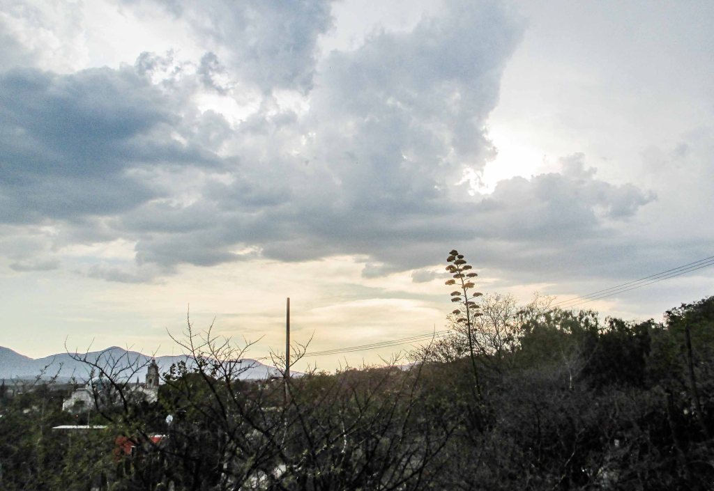 El sol ya comenzaba a bajar, lo tapaban una serie de nubes, relucía la silueta de esa vara larga, cargada de flores, la flor del agave esa planta milagrosa que tiene muchos usos sanadores, al igual que muchos minerales y vitaminas.