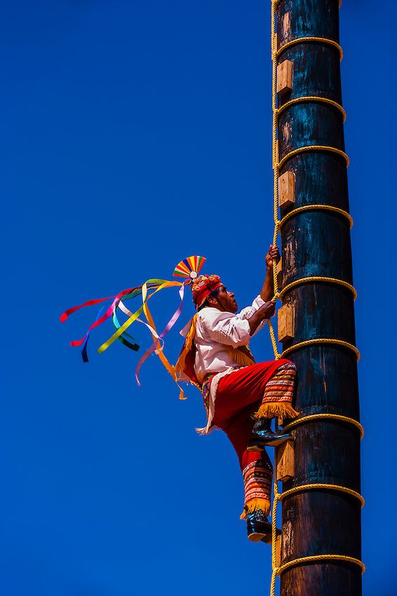 Me quedo mirándolo sin dar cuenta de cuál sería su uso, daba vueltas alrededor, cuando se me acerca un indígena y me comienza a contar de qué se trata, que está ahí plantado para que los Voladores de Papantla hagan la danza sagrada a la lluvia y a la fertilidad, donde se lanzan al vacío atados por cuerdas a los pies desde esa altura, es un rito de la época prehispánica.