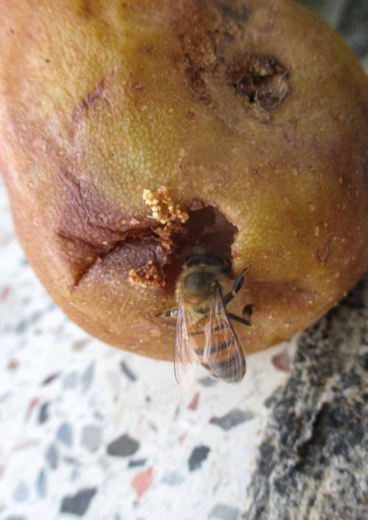 Ya venía con mi roomy, la abejita, que se había instalado sin pedir autorización y sin pagar renta, ni colaborar en el mantenimiento del espacio, a cada rato daba vueltas haciéndome saber que ella aún seguía y que bueno yo estaba como esclava fiel para atenderla, no solo a ella, sino a todas las demás que día con día iban llegando llamadas por las aromáticas peras, que si bien en apariencia lucían que eran un desastre, en su corazón un deleite dulce al que nadie se podía resistir, yacía.