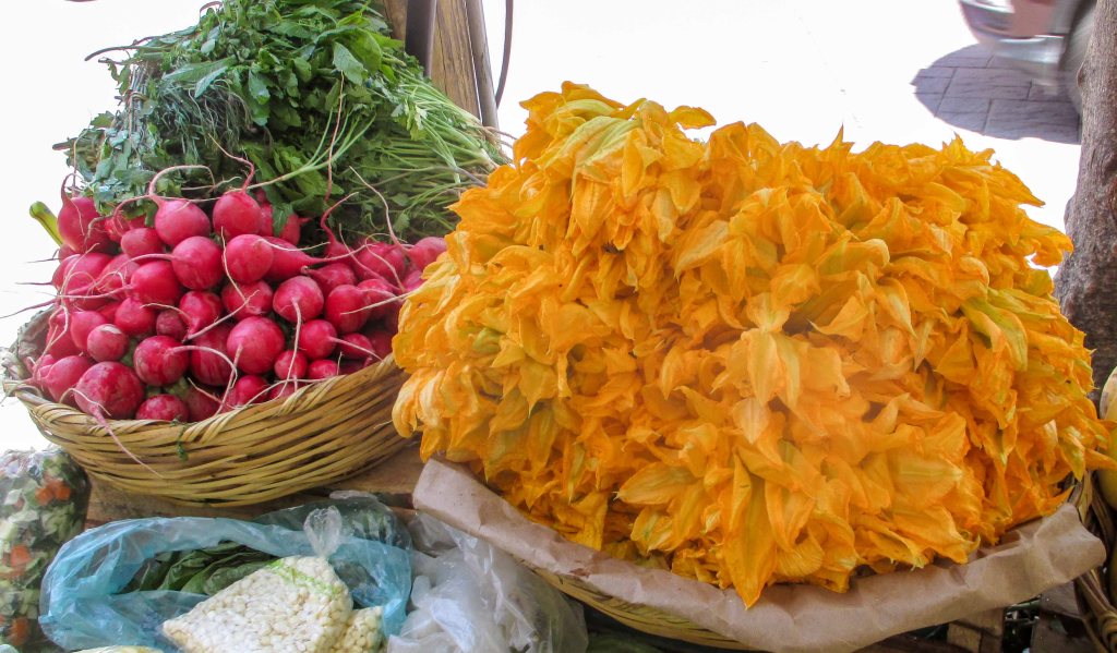 La flor de calabaza y los rabanitos, que abundan en esta época, cosechadas en la mañanita para ir a venderlas al mercado, a todas esas marchantitas que al verlas con tanto atrevimiento mostrando su esplendor, no pueden dejar de pensar en una deliciosa sopa con ellas o hacerlas rellenas de queso, capeadas y en una salsita roja o tal vez mejor, agasajar a su familia con unas quesadillas, sofritadas con mucha cebolla blanca, ajo, sal y chile al gusto y unas hojas de epazote y lo que no puede faltar hebras de queso oaxaca.