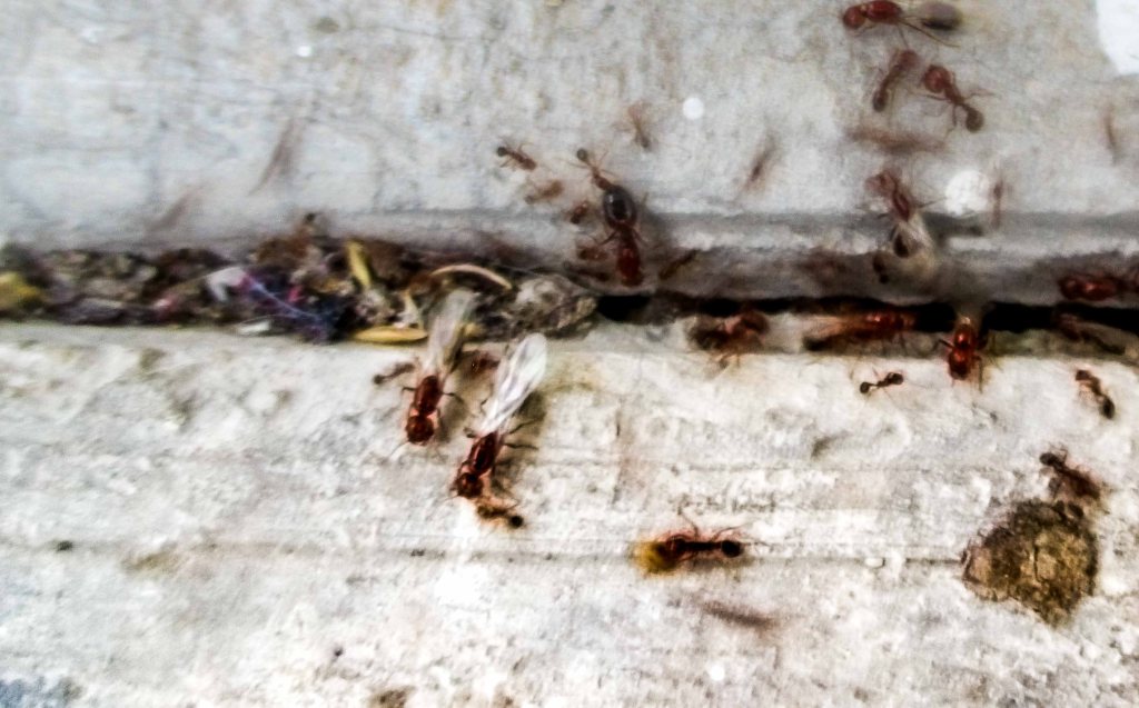 Con cuatro gotas que cayeron el otro día, bueno un poquito más pues permitieron formar una pequeña poza en el patio, se dio la salida de las reinas hormigas para realizar su vuelo nupcial, que generalmente lo hacen en mayo, pero se ve que al no tener ninguna señal, se quedaron en el hormiguero aguardando el mandato para salir a poblar otras tierras. Eso sí, algo que me sorprendió fue, que eran muy poquitas las que asomaron y que este año no llegaron las que caen del cielo.