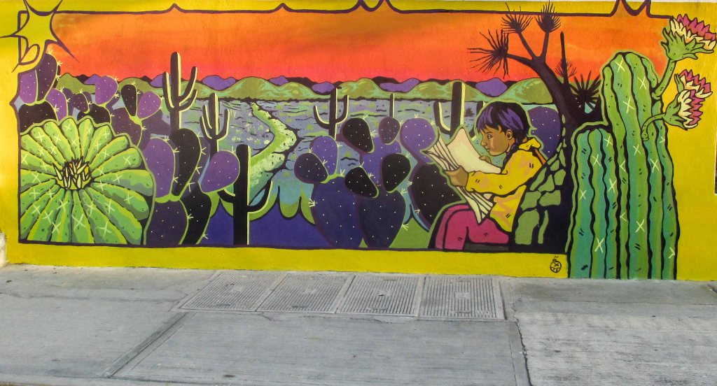 Estaba pasando por el área de las escuelas y cuál fue mi sorpresa cuando al llegar a su entrada, me encontré con un mural, recién pintado, el desierto con su cactus, sus biznagas, sus nopales y lo que no podía faltar un niño en él, leyendo.
