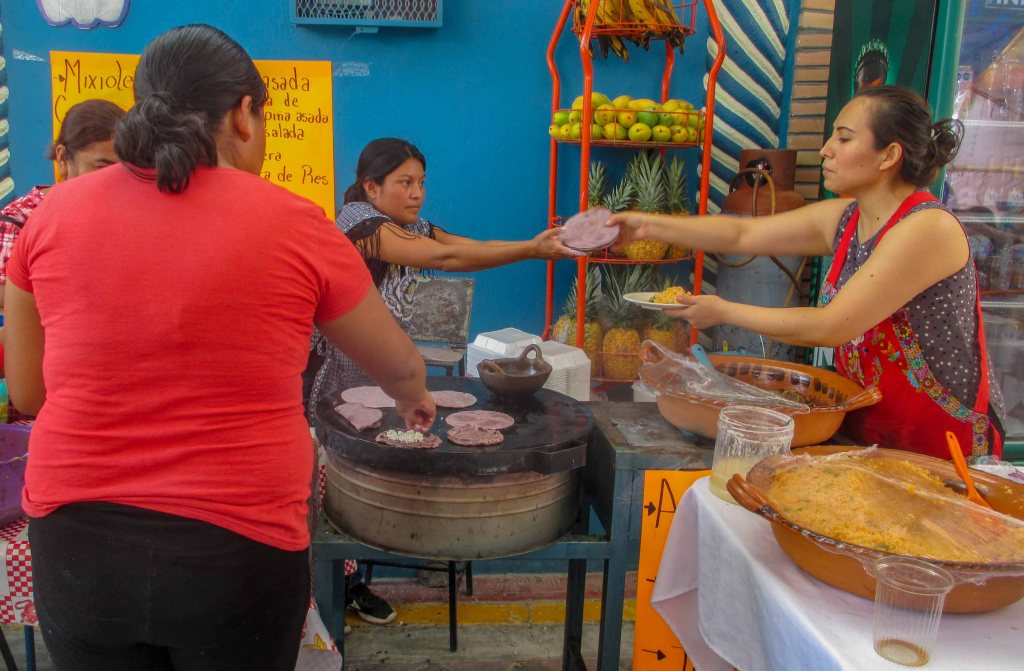 A su lado otro punto imprescindible, las quesadillas, las memelitas hechas de ese maíz azul, al cual por más que quieran, por el momento, no lo pueden volver transgénico, lo que da la absoluta tranquilidad al comerlo de que no está adulterado. Muy buena elección para el desayuno, mientras se espera la llegada de la Calenda y de los demás espectáculos, esos antojitos tan mexicanos.