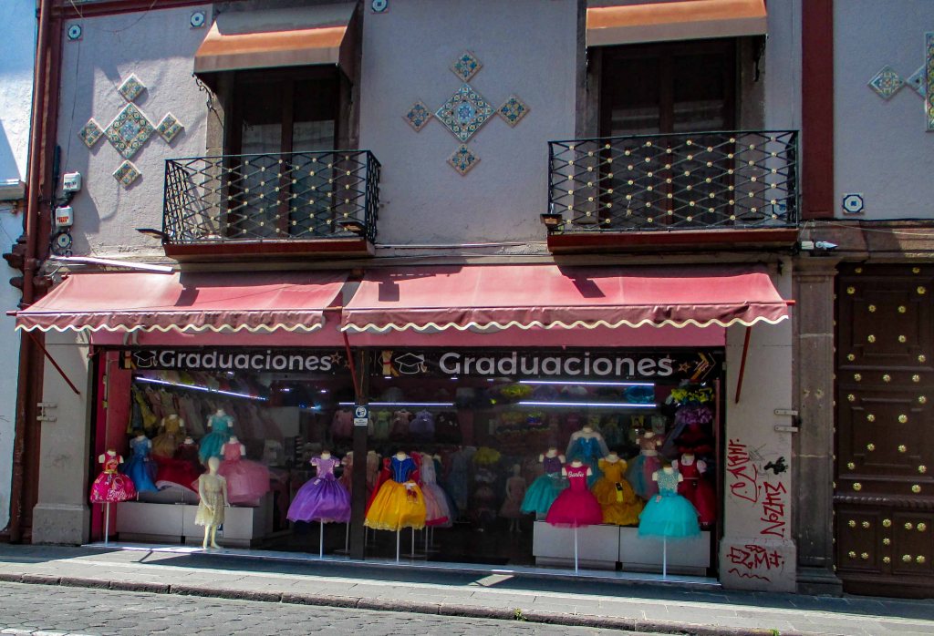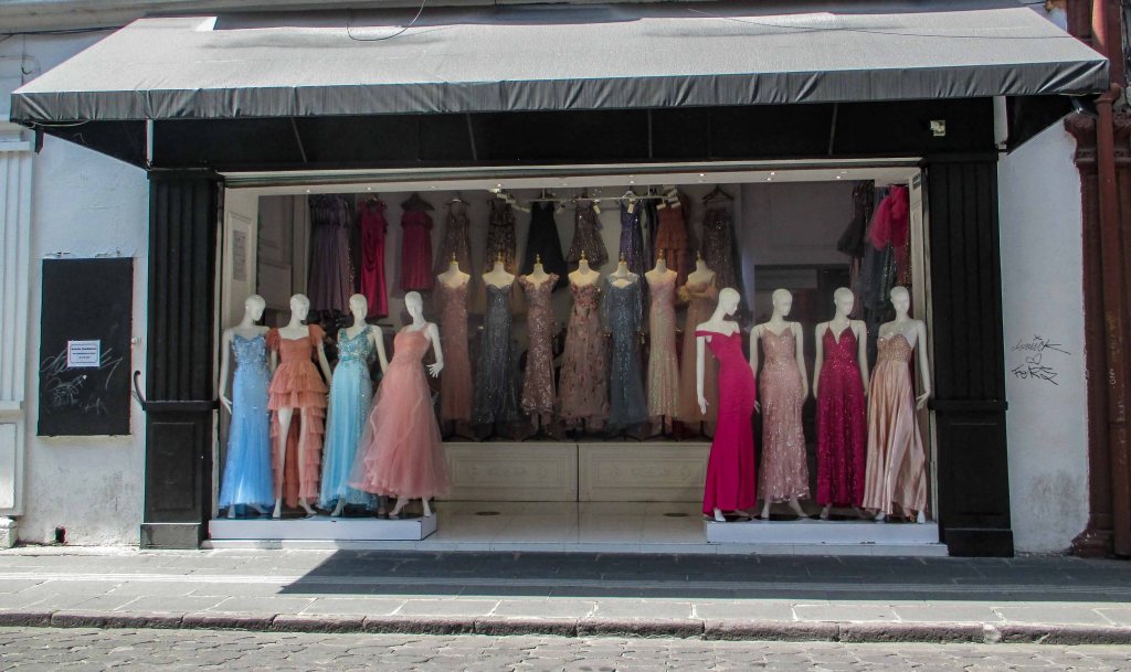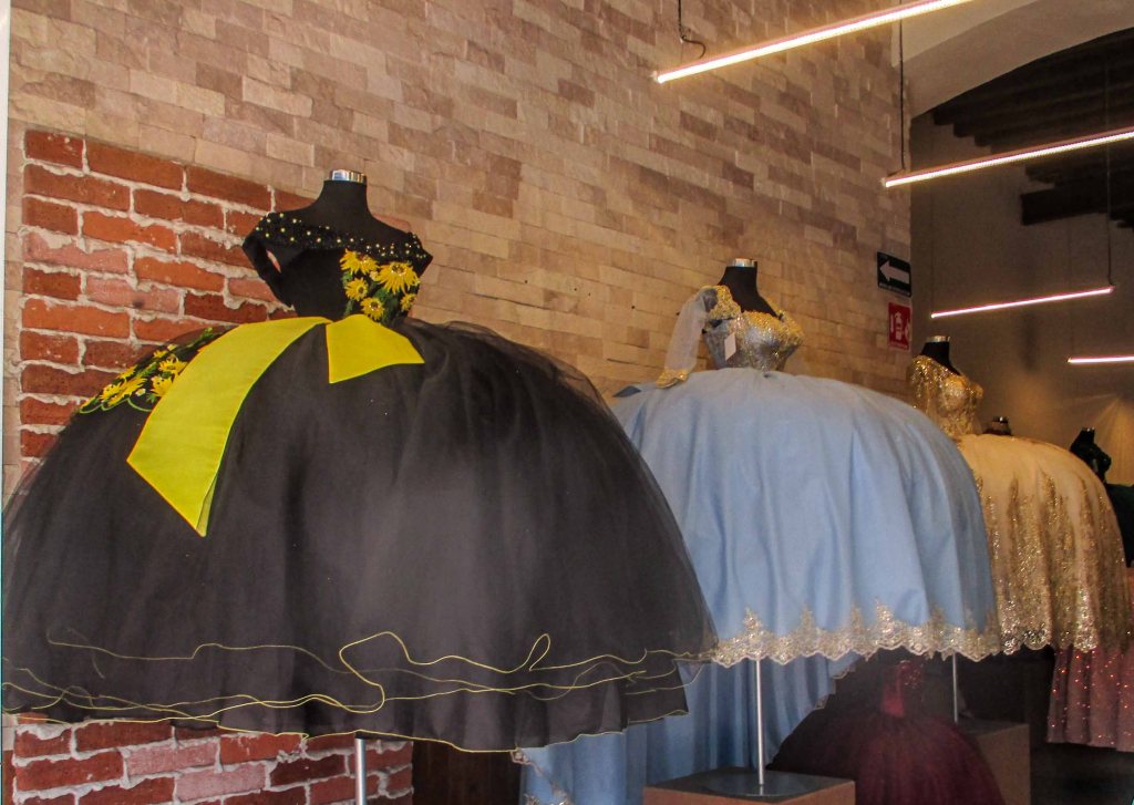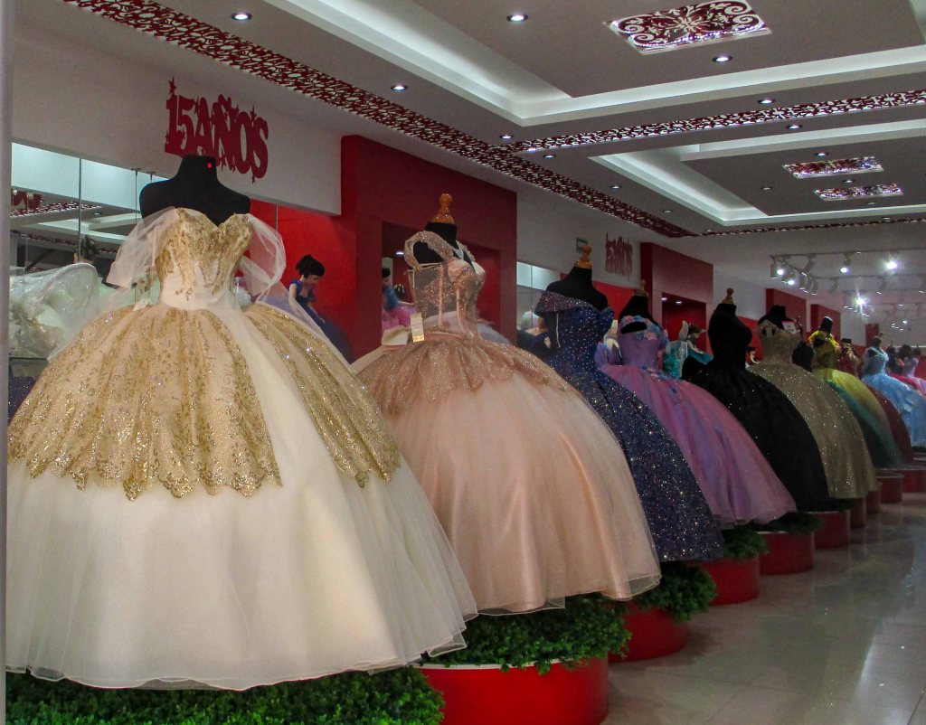 Así lentamente, la calle me fue metiendo en la zona en donde se venden toda la vestimenta de gala para las diferentes fiestas que se festejan en México, como el ritual de los 15 años, donde la adolescente vuelta mujer dentro de un vestido suntuoso hace su aparición en el salón de fiestas y da comienzo a ese baile acompañada de sus chambelanes y terminar con el típico vals con su padre.