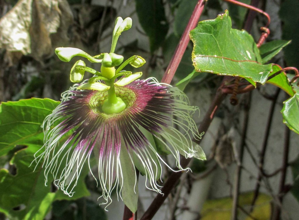 Ahí al darme vuelta me encontré con esa otra maravilla, que en una de sus guías ya cerquita de mis ojos, se erguía con gran orgullo, la flor del maracuyá o mburucuyá, depende del nombre por qué parte de América se ande.