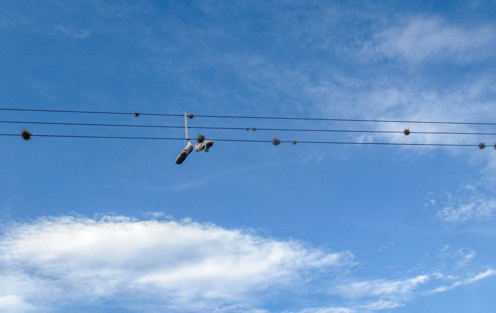 Al llegar después de subir la cuesta, de detenerme unos momentos a tomar aire y agua, me recibieron unos tenis colgados en los cables, me hicieron interrumpir el camino, en México, se dice que suelen colgarlos cuando alguien ha muerto, de ahí que hay una frase que dice: «colgar los tenis». Más allá eran los primeros que veía en el pueblo.