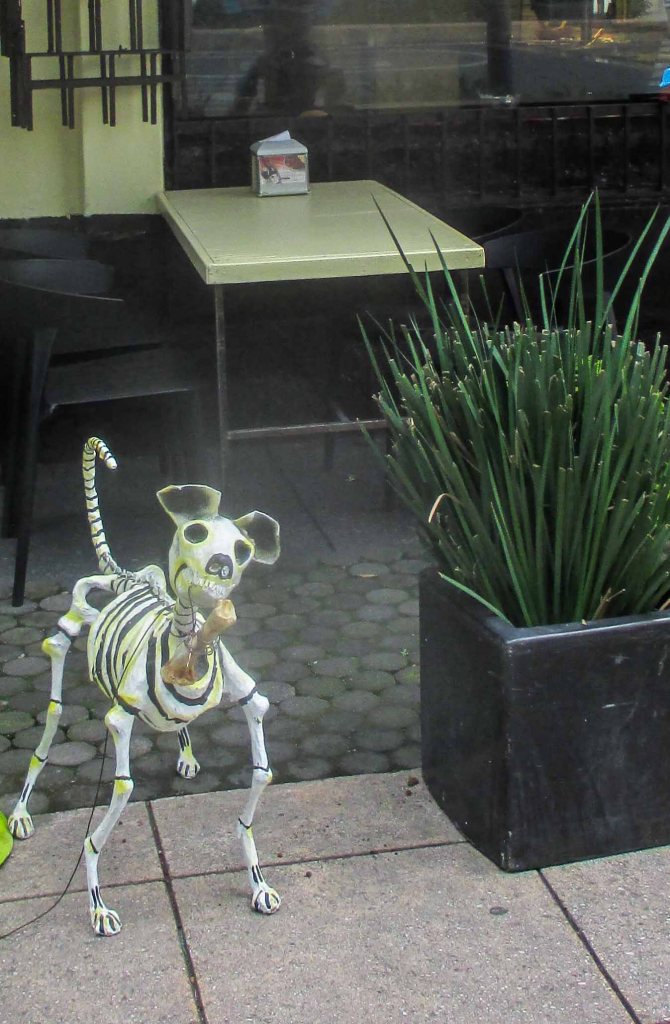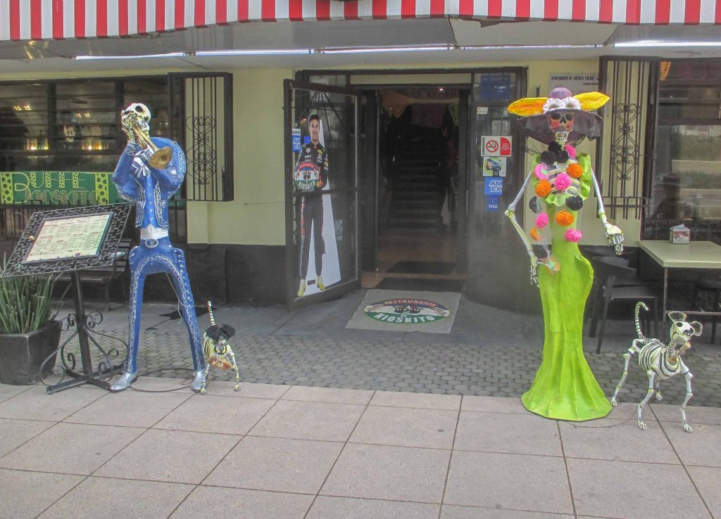 De repente me encontré frente a un restaurant donde estaba adornado con el mariachi tocando la trompeta y «La Calavera Garbancera», los dos acompañados por el que no puede faltar: el perro, ese que los ayudó a cruzar ese río imprescindible para que se inicie el camino a descarnarse y cuando ello suceda llegar a ese espacio tan anhelado donde el descanso eterno nos aguarda y nos libera de toda carga.