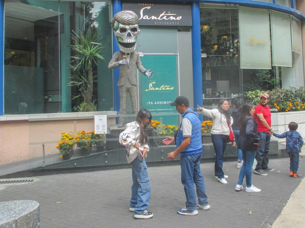 Me quedé un poco observando el comportamiento de los que estaban alrededor, sus risas, muchas de ellas medias histéricas, hablando en voz alta en diferentes idiomas, como sorprendidos, su gestos, su asombro, ese encuentro con ese mundo que en cierta forma no entendían que existiera, esa celebración tan alocada, la Muerte, «La Huesuda», en calacas gigantes de cartonería representando a diferentes artistas, ahí estaban.