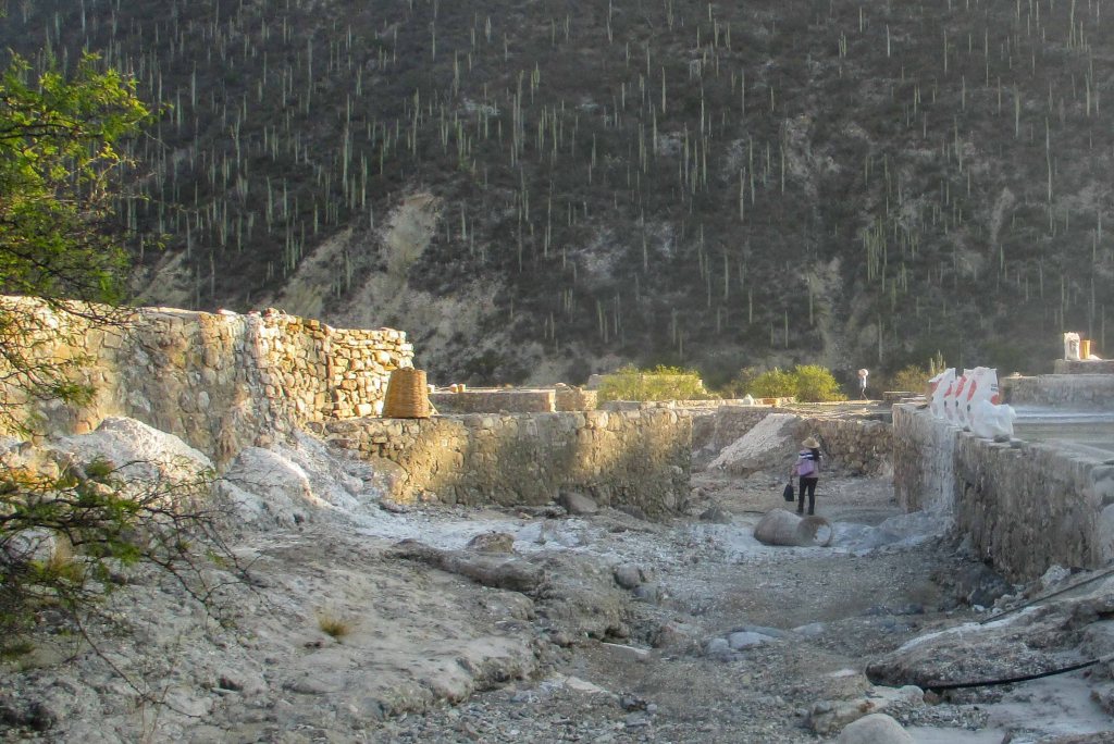 Se lo respiraba en el gran silencio, ni un solo humano se apareció durante todo ese trayecto, sin embargo parecía oírse las voces de las mujeres de Chilac, un pueblo cercano, del otro lado de la montaña, que caminando entre las barrancas en el siglo pasado y en el anterior, llegaban a estos parajes de las salinas a ofrecerles a los trabajadores los sabrosos alimentos que ellas preparaban, o los sombreros de palma que hacían o el aguardiente, eso sí, llegaban a acuerdos pues hasta que no se vendiera la sal no había dinero y así es la vida de los salineros, había que esperar la época de los calores para que llegaran de todas partes a solicitar esa sal que allí se cosechaba.