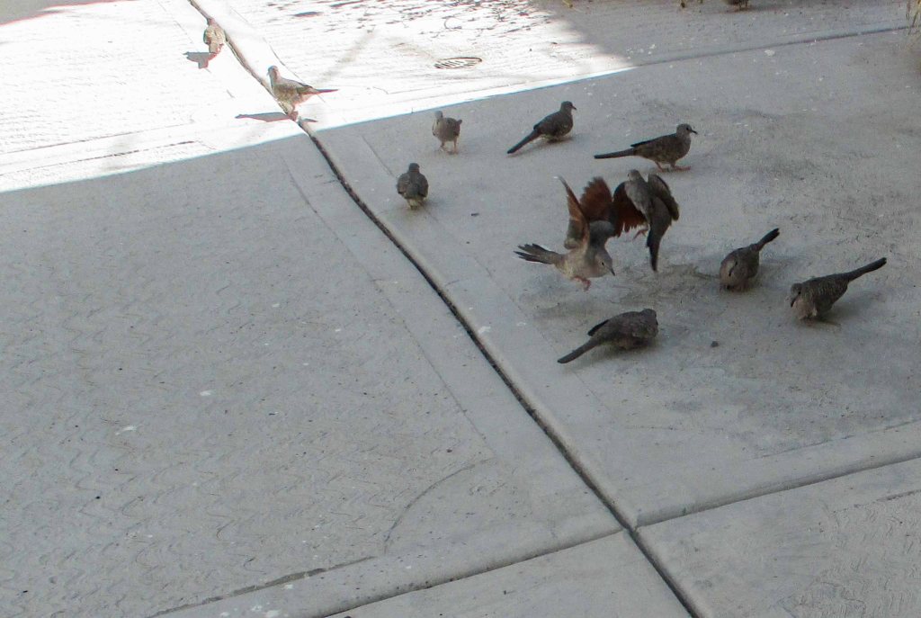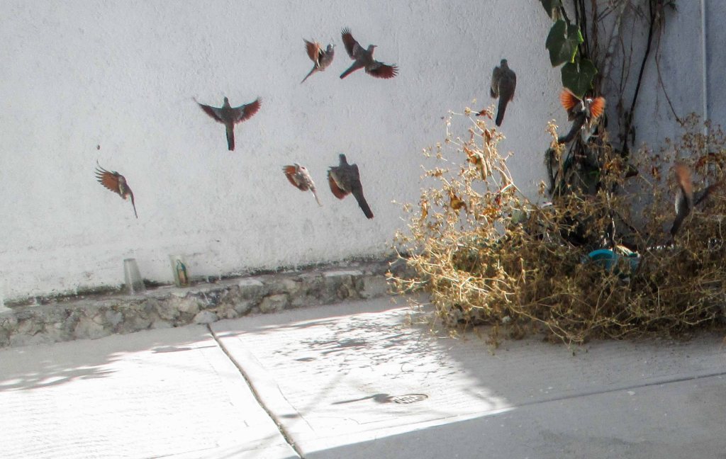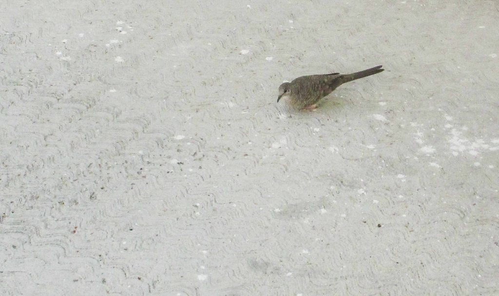 Las que también estaban medias enloquecidas eran las tortolitas, Coquita volvió a entrar a la casa a pedir comida, se veía que no estaba tan fácil el encontrarla y como ya espera para venir que no haya ninguna de las otras que la pelean y con el agua que caía, todos los horarios estaban trastocados, decidió pedir cuando llegaba. Salía y le esparcía un poquito en algún lugar que estuviera un poco seco, pues el patio de repente se inundaba. Ella feliz comía.