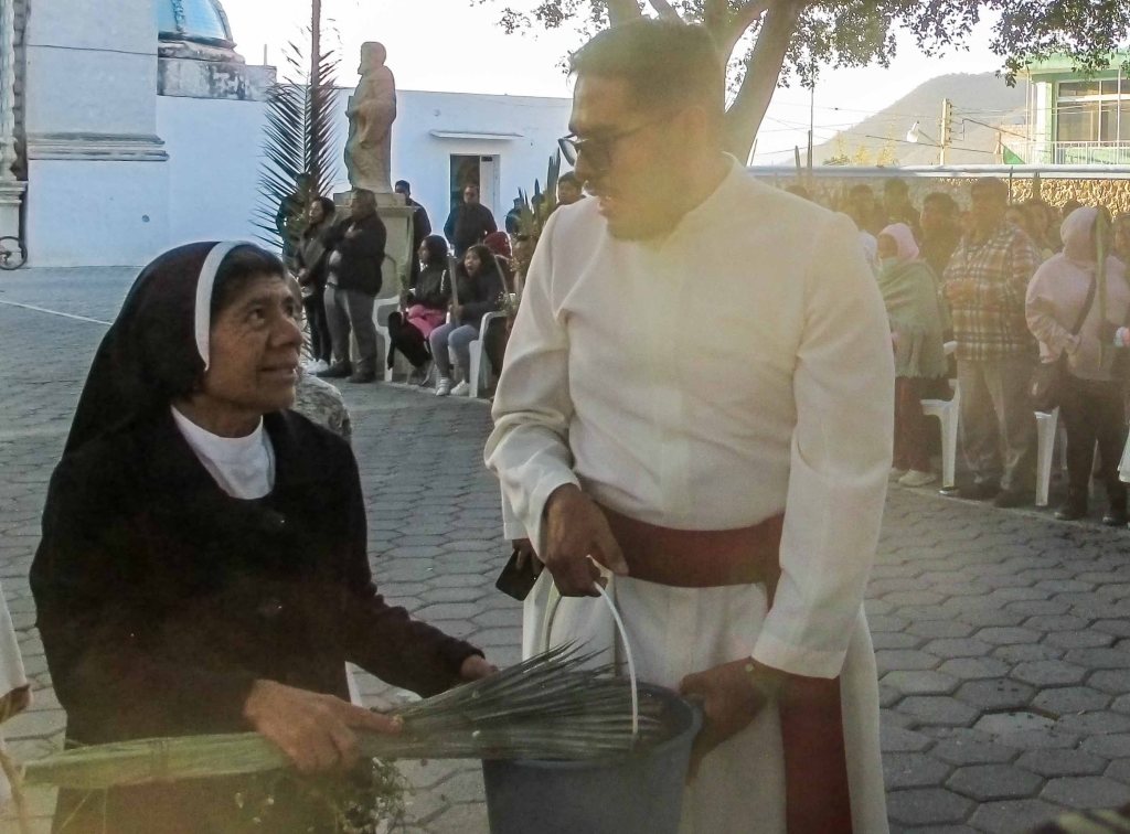 De un lado una hermana que con gran dulzura y amor iba dejando caer esa agua bendecida sobre esas ramas.