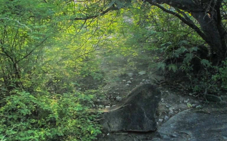 Acepté la invitación, crucé entre esas dos piedras que se abrían para que pasara, lo hice con la cabeza gacha, en son de humildad y también por sus ramas bajas, en esa arboleda chaparra que me invitaba, las luces revoloteaban y mostraban el contento, como si de verdad gozaran de sentirse ataviadas con el brillo de la esmeralda y con ello lucirse maquilladas.