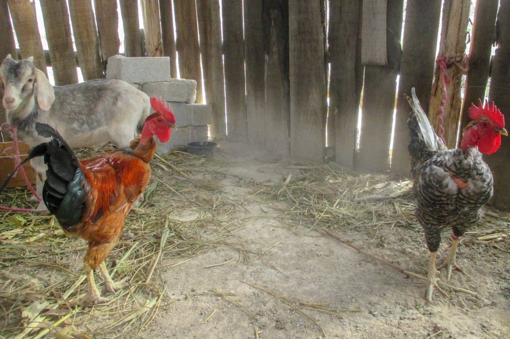 Ahí tenía a otros inquilinos a su cuidado, a una chivita chiquita que era de una señora y ella se la estaba custodiando y dos gallos, uno de ellos muy orondo recorría todo el espacio y el otro estaba amarrado.